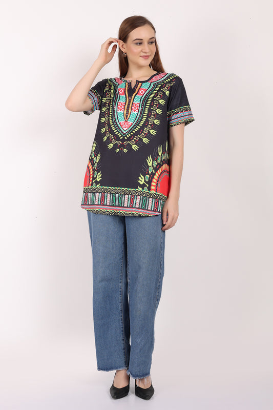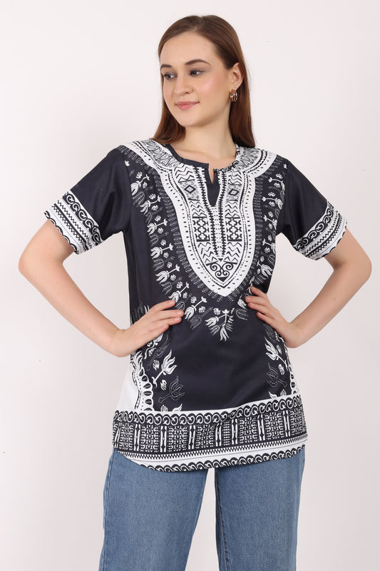 Blusa Afrocaribeña de Dama Estampado Negro con Blanco