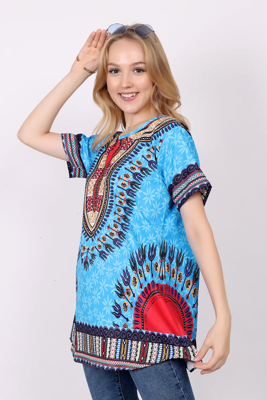 Blusa Afrocaribeña de Dama Estampado Azul Turquesa