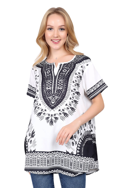 Blusa Afrocaribeña de Dama Estampado Blanco con Negro