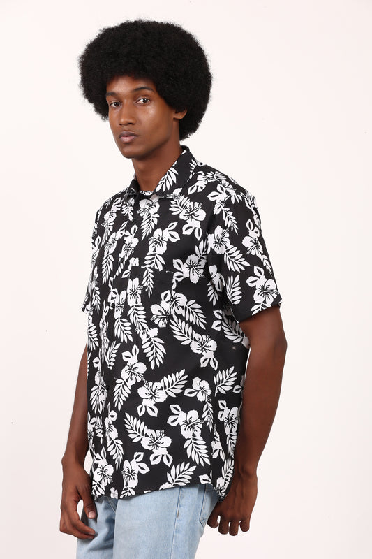 Camisa Hawaiana Playera Caribeña de Caballero Estampado Negro con Flores