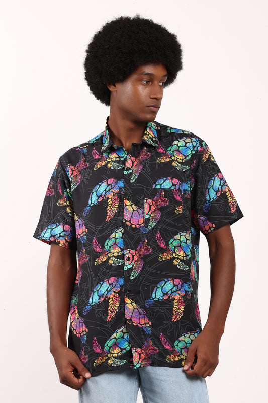 Camisa Hawaiana Playera Caribeña de Caballero Estampado Tortugas Vibrantes Neón