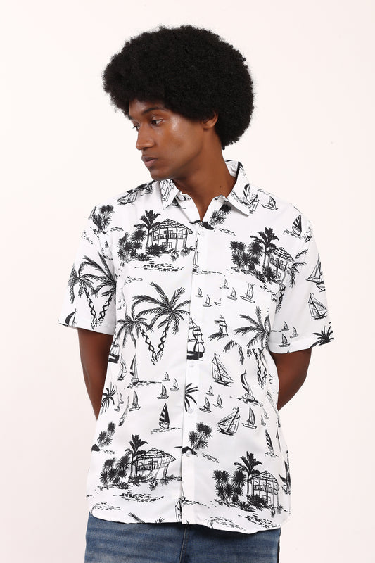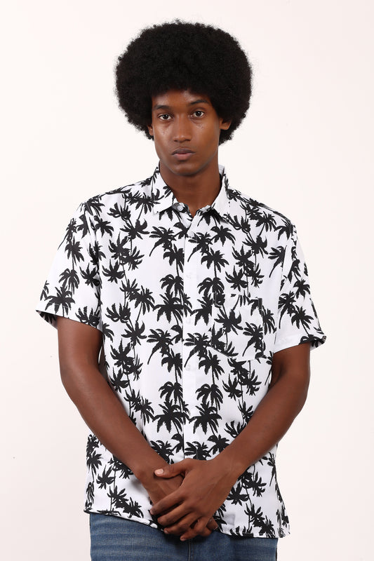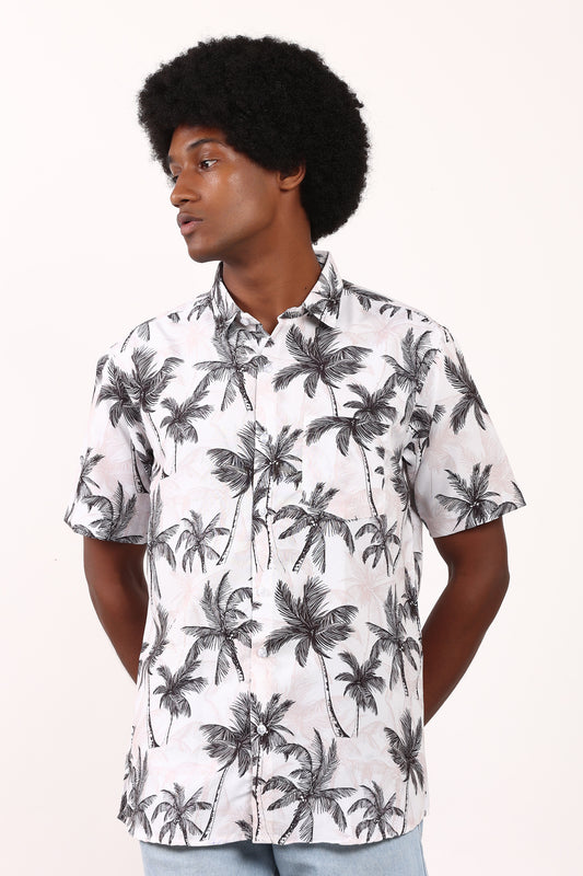 Camisa Hawaiana Playera Caribeña de Caballero Estampado Palmeras Fondo Blanco