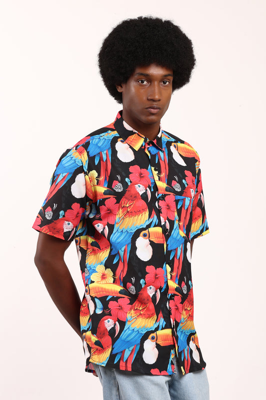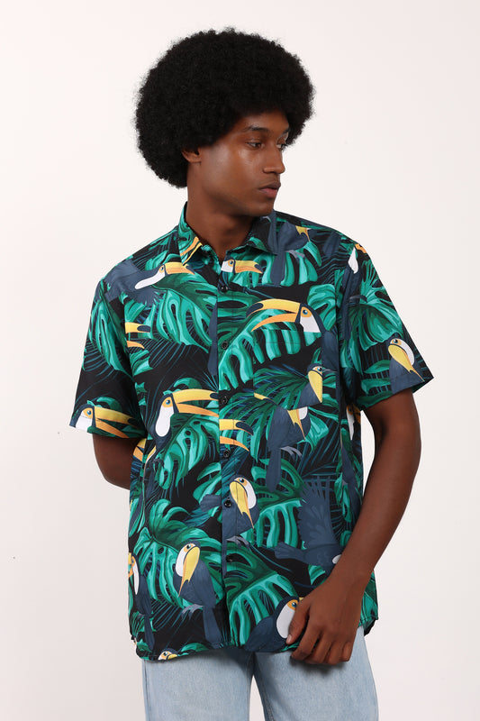 Camisa Hawaiana Playera Caribeña de Caballero Estampado Tucan Grande Selva Negra