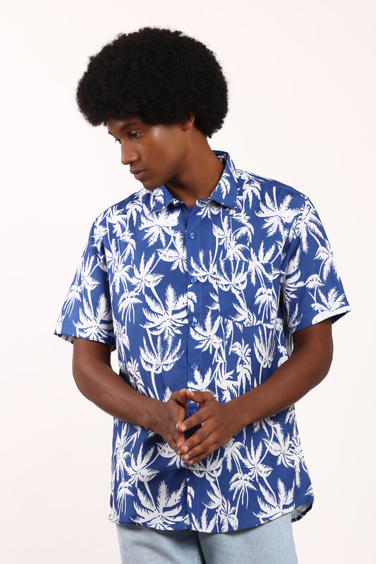 Camisa Hawaiana Playera Caribeña de Caballero Estampado Palmeras Azules