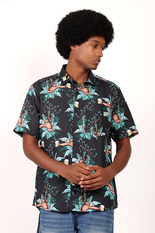 Camisa Hawaiana Playera Caribeña de Caballero Estampado Oso Perezoso Grande con Cerveza