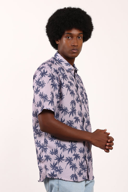 Camisa Hawaiana Playera Caribeña de Caballero Estampado Morado con Palmeras