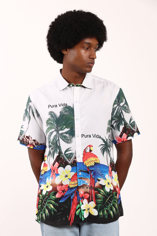 Camisa Hawaiana Playera Caribeña de Caballero Estampado Loros Lapas Pura Vida