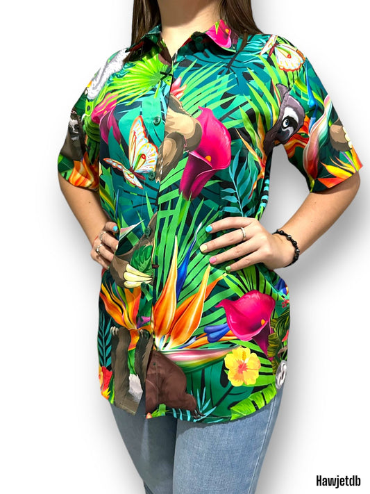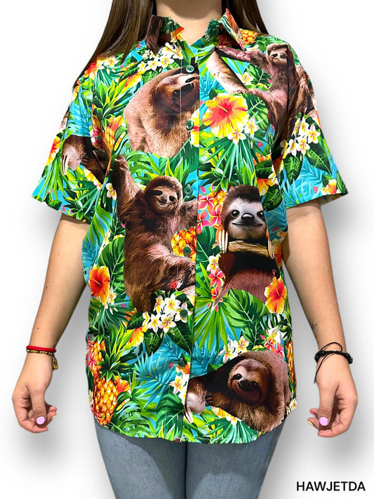Camisa Hawaiana Playera Caribeña de Dama Oso Perezoso