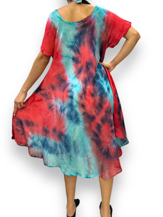 Vestido de Dama Azul y Rojo Veteado con mangas