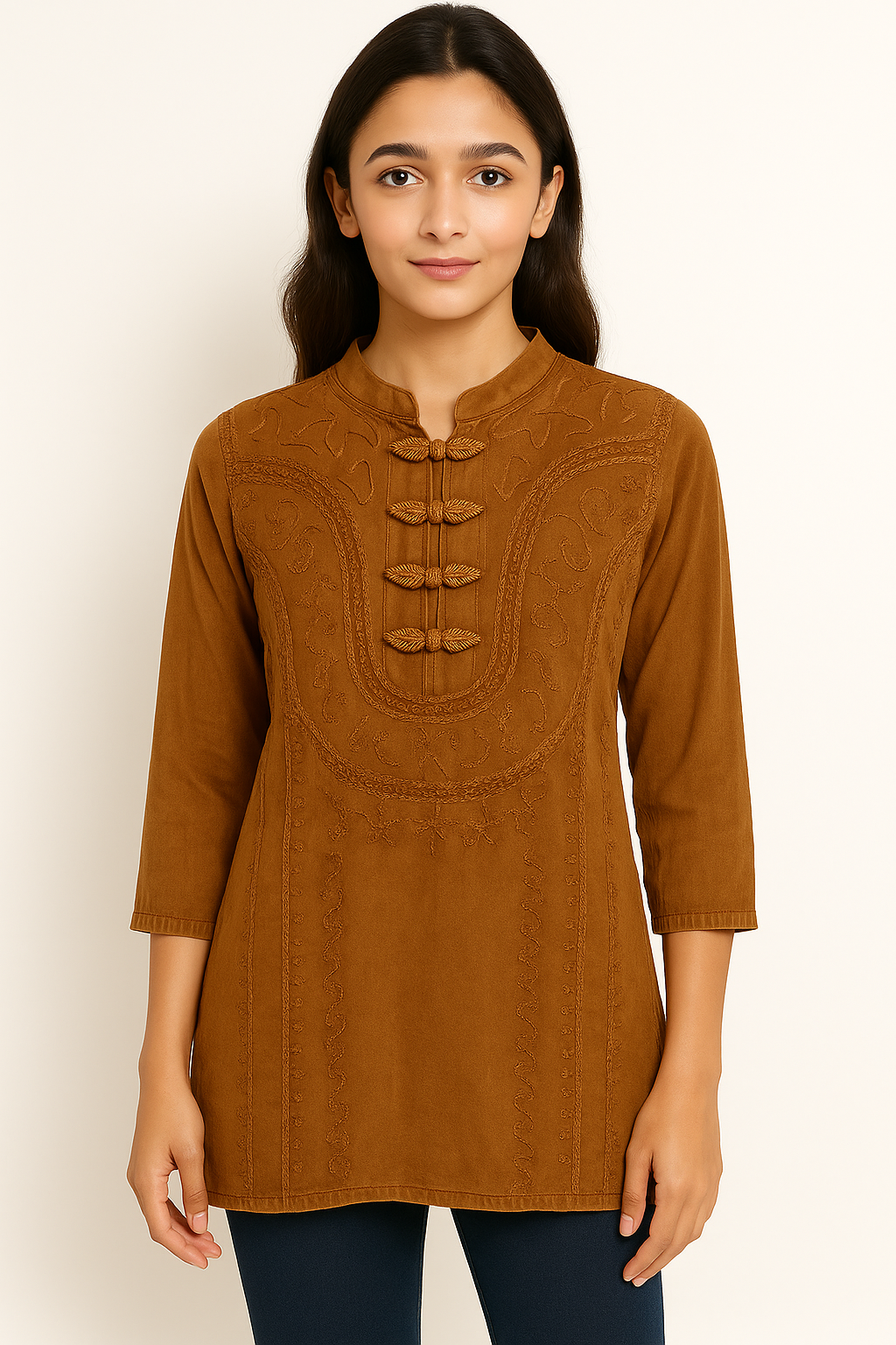 Confeccionada en suave tela tipo liviana en rayón, su diseño destaca por los delicados bordados hechos a mano y los elegantes botones de nudo al frente, que evocan el encanto de la moda india contemporánea.