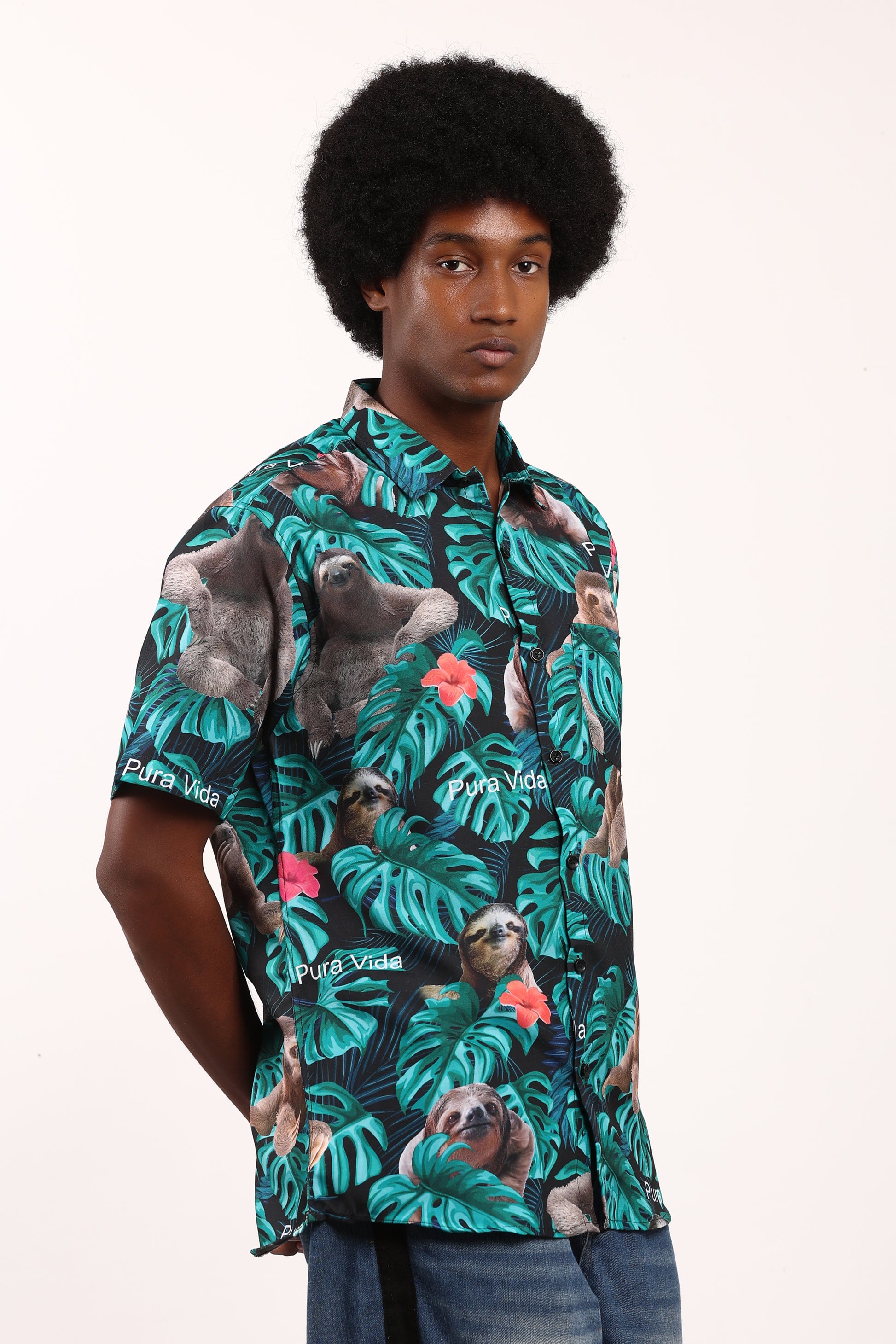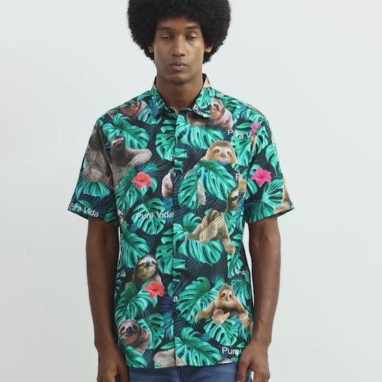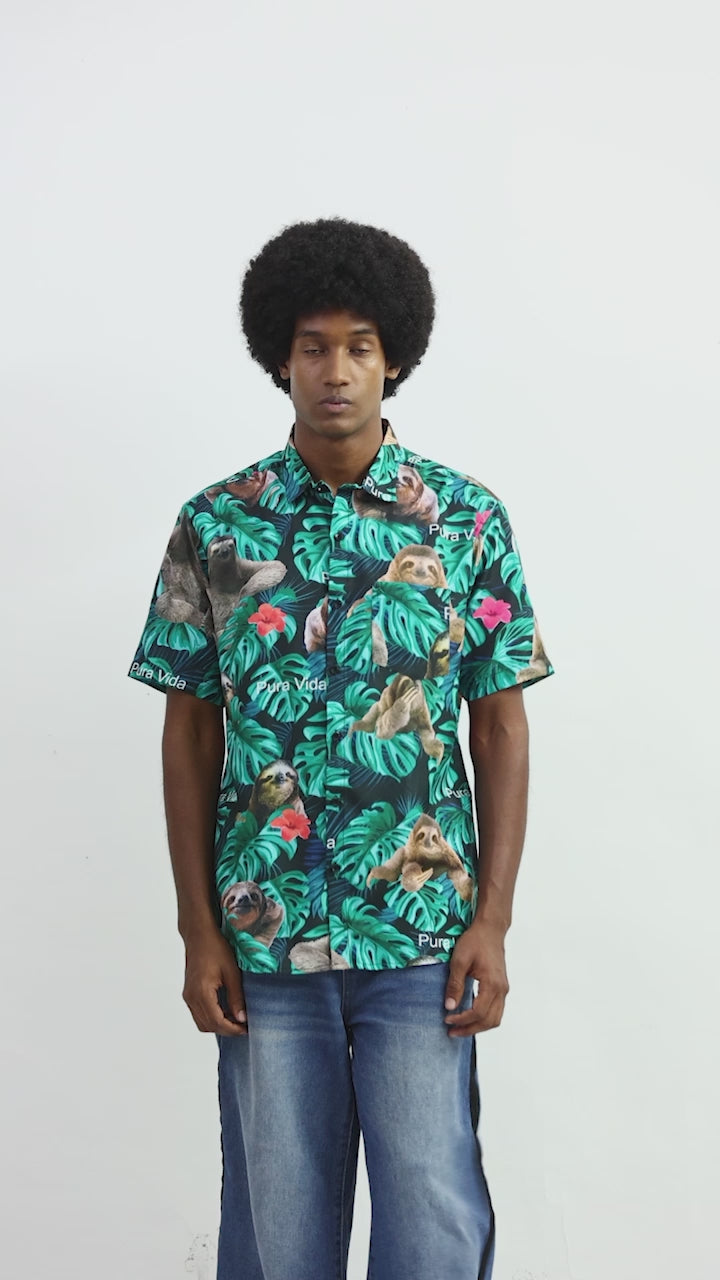 Camisa Hawaiana Playera Caribeña de Caballero Estampado Oso Fondo Negro Pura Vida