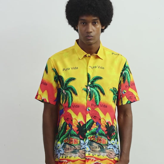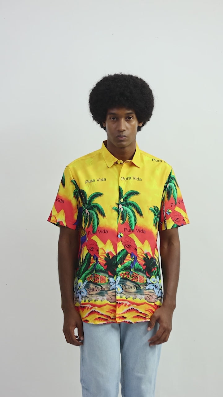 Camisa Hawaiana Playera Caribeña de Caballero Estampado Palmeras Fondo Amarillo Pura