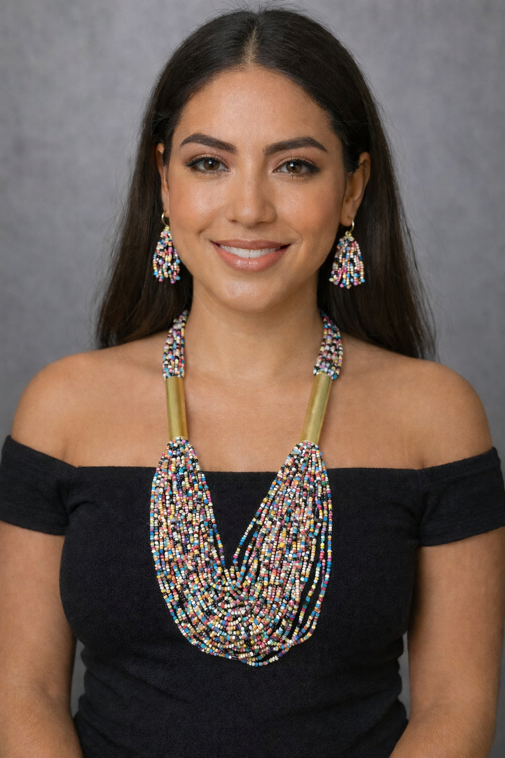 Su diseño multihilos con detalles dorados crea una pieza llamativa y versátil, ideal para realzar atuendos sencillos o complementar looks bohemios y étnicos con personalidad.