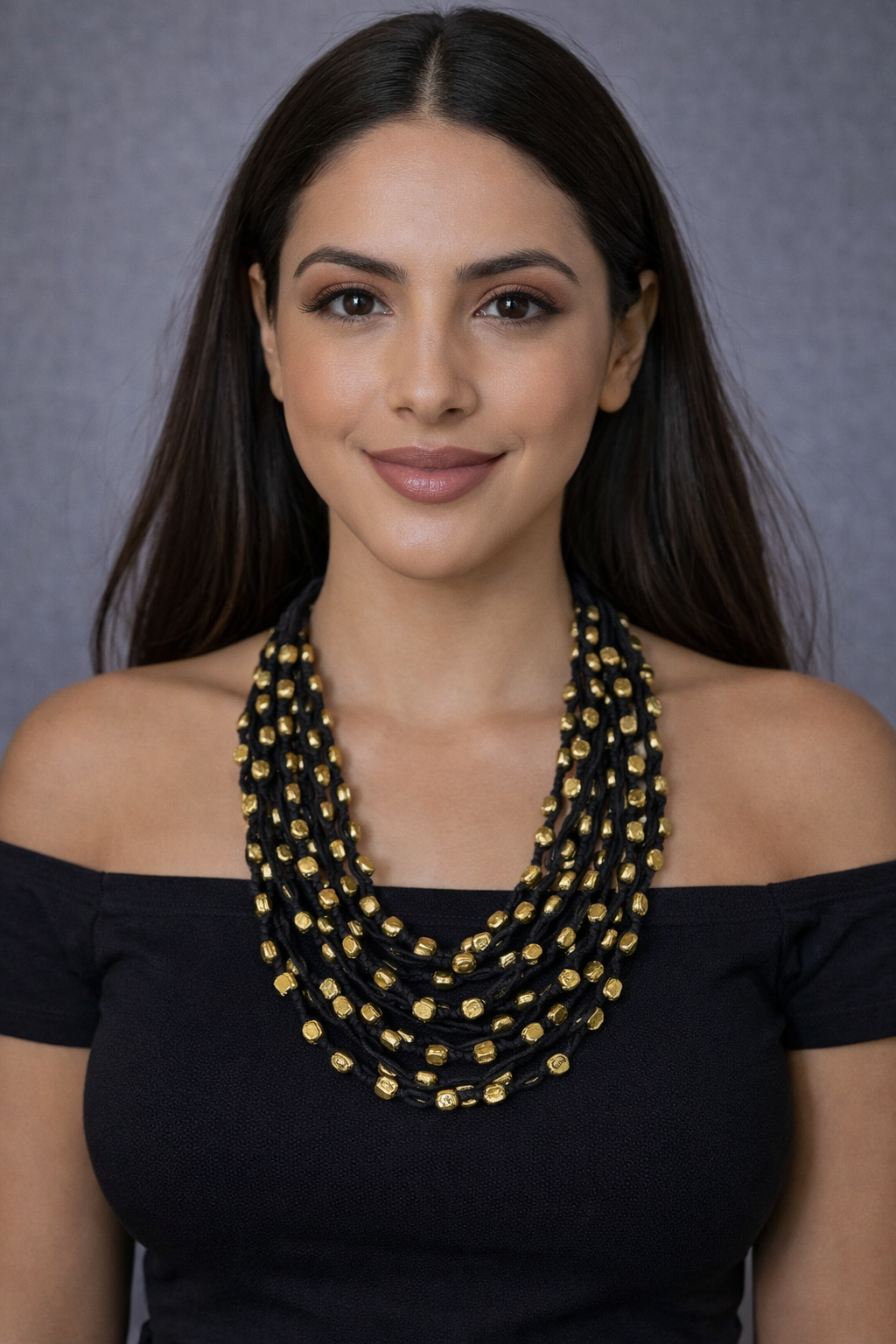 Descubrí la elegancia y el contraste de este collar artesanal en tonos negro y dorado, diseñado para aportar sofisticación y carácter a cualquier look.