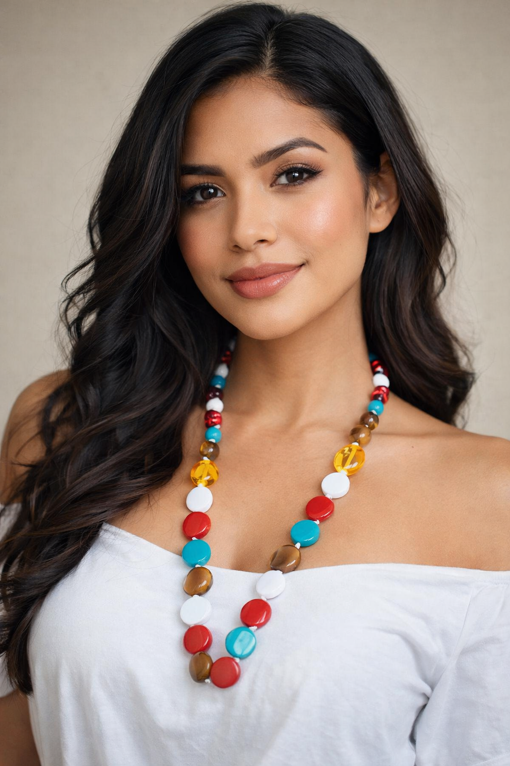 Su combinación de cuentas redondas en tonos turquesa, rojo, blanco, ámbar y tierra crea una pieza equilibrada y llamativa, ideal para looks frescos, veraniegos y estilos bohemios con un toque moderno. Perfecto para usar con prendas claras y resaltar el escote de forma natural y elegante.